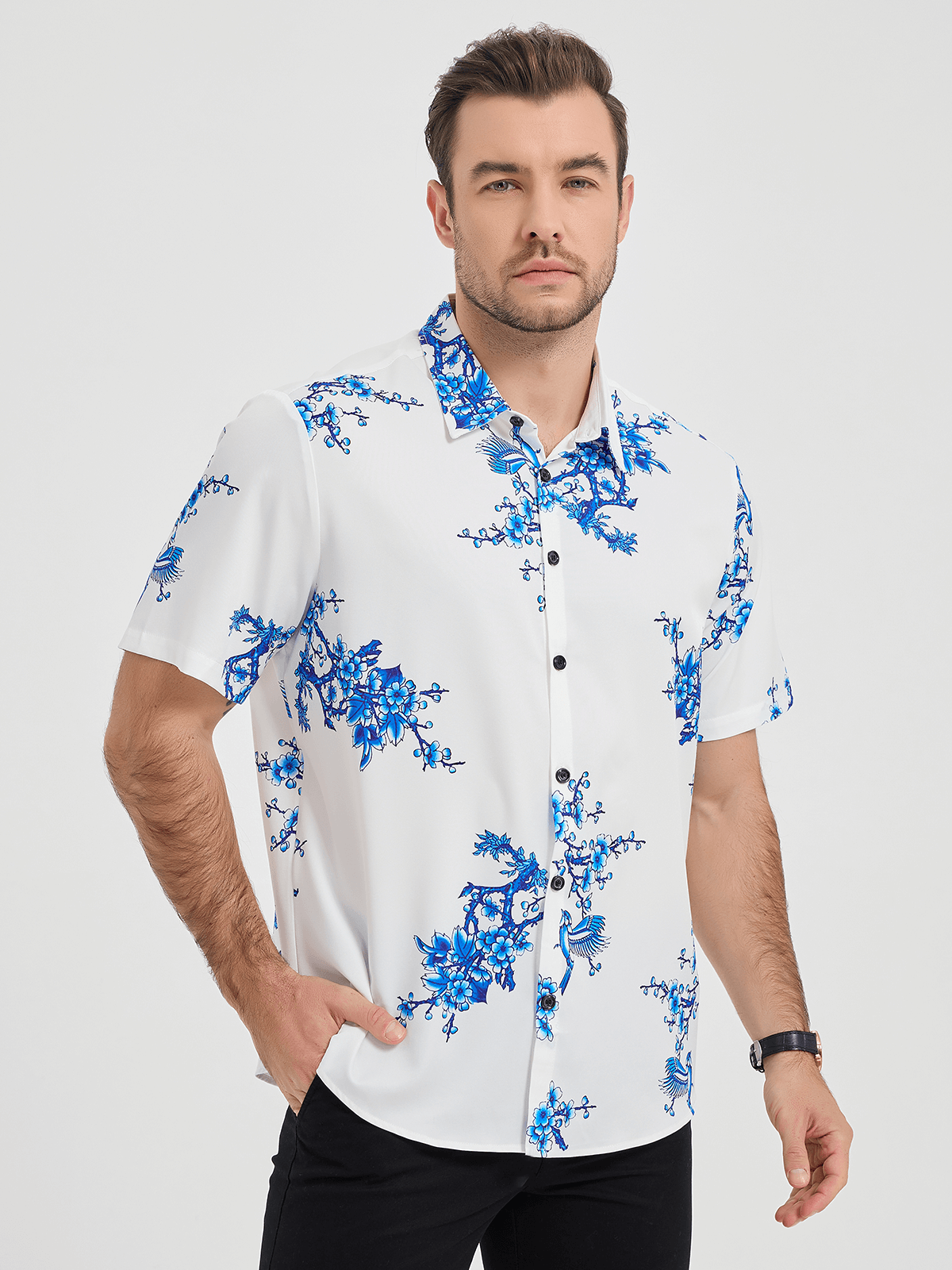 Men's Blue Floral Printed Button Up Short Sleeve Casual Shirt