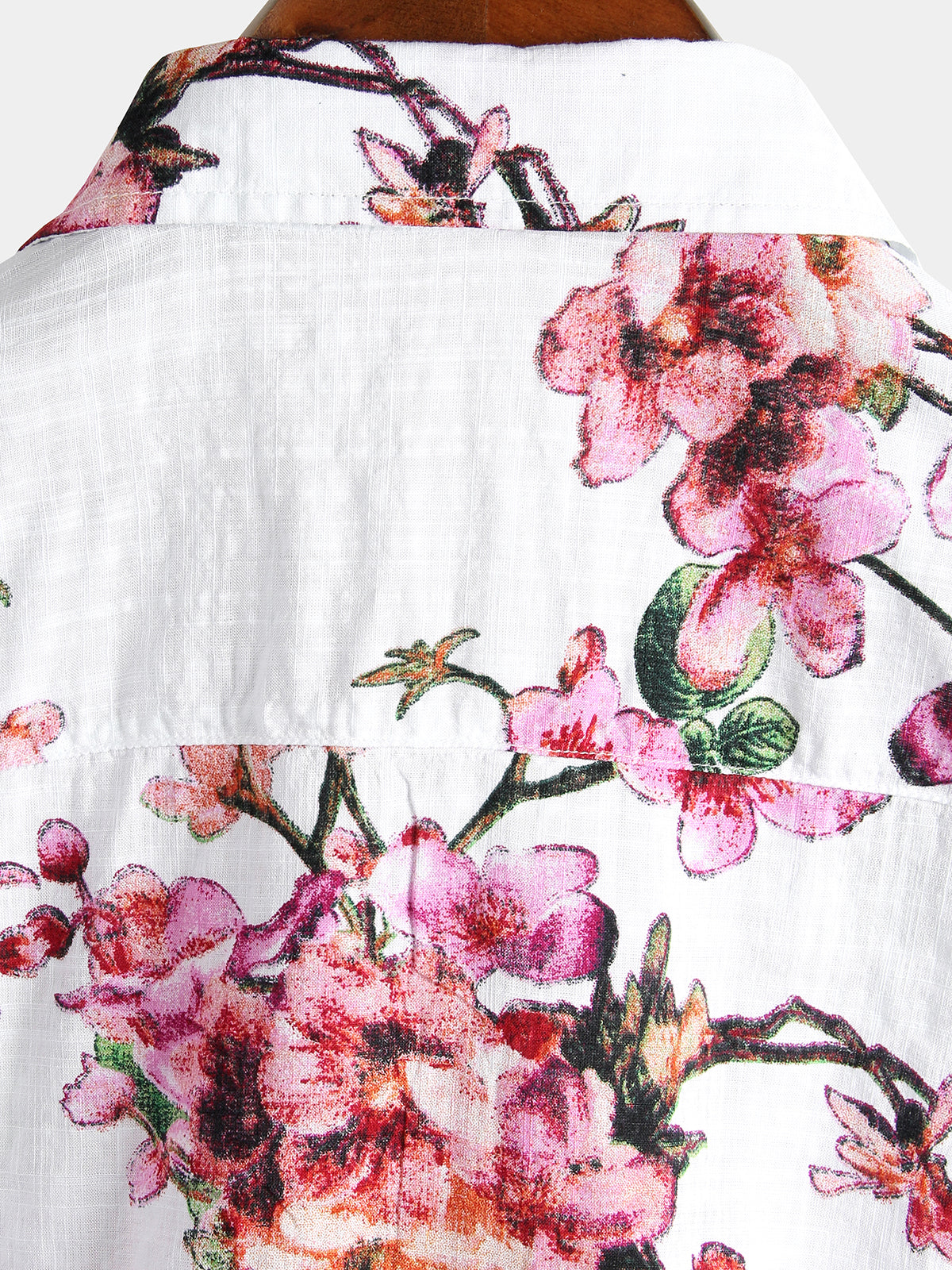 Men's Flower Print Cotton Hawaiian Floral Button Short Sleeve Shirt