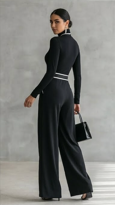 The fitted top combined with wide-leg trousers creates a sleek, elongated shape that enhances your natural figure.